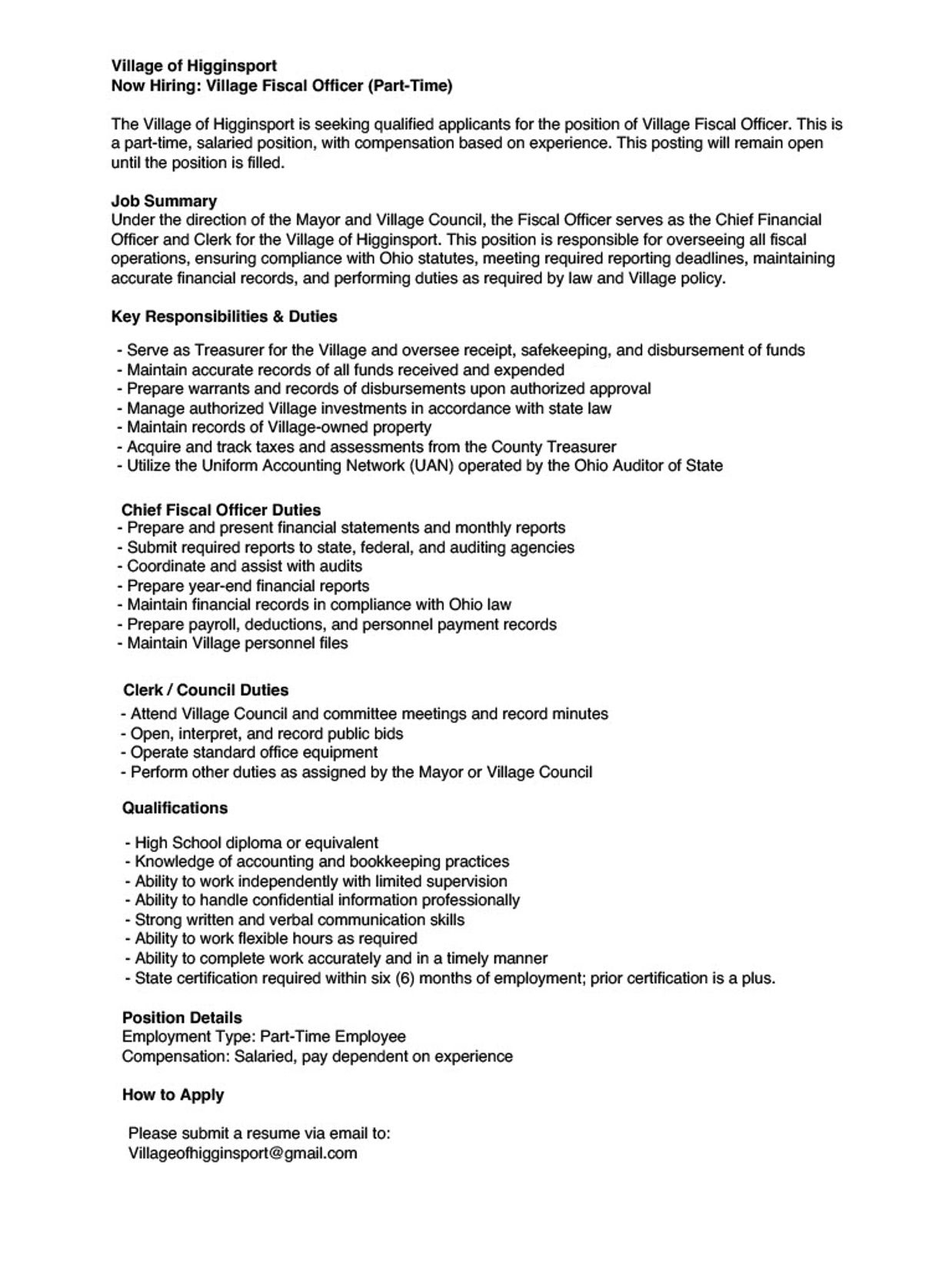 Help Wanted - Village Fiscal Officer (see News tab for details)